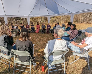 We open and close in a circle of communion. In between, we learn, restore, expand our knowledge and awareness, reflect on our experiences, hold grief close, sing, connect, and create. We share a meal, honor our ancestors, listen, open, celebrate, and breathe, all in the embrace of the season and the land.